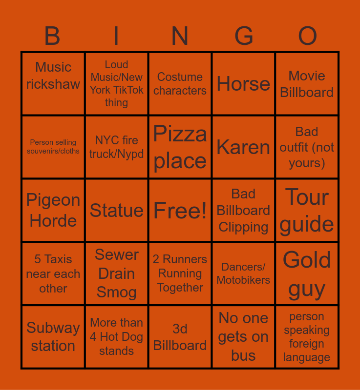 This bingo card has a free space and 24 words: Sewer Drain Smog, More than 4 Hot Dog stands, Pizza place, Subway station, Movie Billboard, Music rickshaw, Person selling souvenirs/cloths, Loud Music/New York TikTok thing, Bad Billboard Clipping, 2 Runners Running Together, Karen, Pigeon Horde, Dancers/ Motobikers, Gold guy, NYC fire truck/Nypd, No one gets on bus, Tour guide, Costume characters, Bad outfit (not yours), Statue, person speaking foreign language, 5 Taxis near each other, Horse and 3d Billboard.