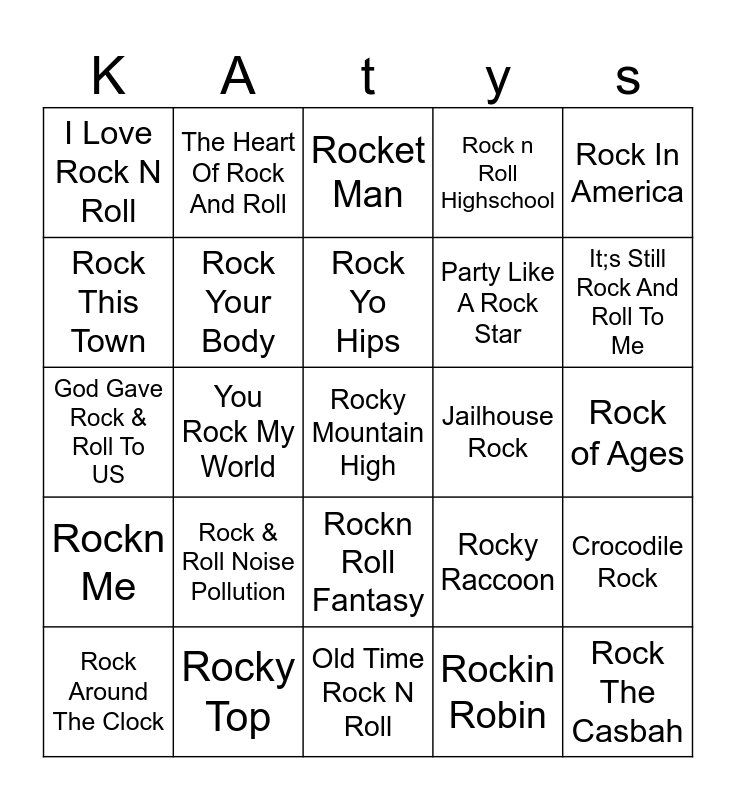 This bingo card has a free space and 31 words: Old Time Rock N Roll, Rock And Roll All Night, You Rock My World, We will RoCK YOU, I Love Rock N Roll, Rocket Man, Rock Your Body, Rocky Raccoon, Jailhouse Rock, Rockin Robin, Rock of Ages, Rock The Casbah, Rock The Boat, Rocket Queen, It;s Still Rock And Roll To Me, I Wanna Rock, Crocodile Rock, Rock & Roll Noise Pollution, Rockn Me, Rockn Roll Fantasy, Rock In America, It's Only Rock & Roll but,,,, Rock Around The Clock, The Heart Of Rock And Roll, Party Like A Rock Star, Rock This Town, Rock n Roll Highschool, God Gave Rock & Roll To US, Rocky Top, Rock Yo Hips and Born To Run.