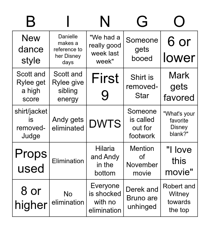 This bingo card has a free space and 24 words: Elimination, No elimination, First 9, 8 or higher, 6 or lower, New dance style, Scott and Rylee get a high score, Danielle makes a reference to her Disney days, Someone is called out for footwork, Hilaria and Andy in the bottom, Shirt is removed-Star, shirt/jacket is removed-Judge, Mention of November movie, "I love this movie", Scott and Rylee give sibling energy, Derek and Bruno are unhinged, "What's your favorite Disney blank?", "We had a really good week last week", Mark gets favored, Andy gets eliminated, Robert and Witney towards the top, Props used, Someone gets booed and Everyone is shocked with no elimination.