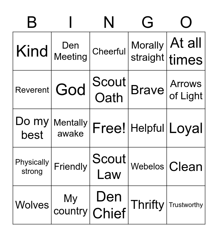 This bingo card has a free space and 40 words: Honor, Do my best, Do my duty, God, My country, Scout Law, Scout Oath, Help other people, At all times, Physically strong, Mentally awake, Morally straight, Trustworthy, Loyal, Helpful, Friendly, Courteous, Kind, Obedient, Cheerful, Clean, Thrifty, Brave, Reverent, Outdoor manners, Careful with fire, Considerate of the outdoors, Conservation minded, Pack 551, Lions, Tigers, Wolves, Bears, Webelos, Arrows of Light, Den Chief, Patrol, Pack Meeting, Den Meeting and Den Leader.