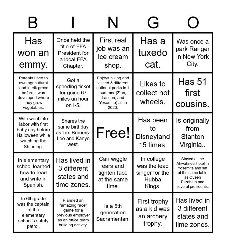 This bingo card has a free space and 24 words: In 6th grade was the captain of the elementary school’s safety patrol., Has lived in 3 different states and time zones., Enjoys hiking and visited 3 different national parks in 1 summer (Zion, Lassen, and Yosemite) all in 2023., First trophy as a kid was an archery trophy., Was once a park Ranger in New York City., Has won an emmy., Once held the title of FFA President for a local FFA Chapter., First real job was an ice cream shop., Has been to Disneyland 15 times., Is originally from Stanton Virginia.., Wife went into labor with first baby day before Halloween while watching the Shinning., Got a speeding ticket for going 67 miles an hour on I-5., In college was the lead singer for the Hubba Kings., Stayed at the Ahwahnee Hotel in Yosemite and sat at the same table as Queen Elizabeth and several presidents., Parents used to own agricultural land in elk grove before it was developed where they grew vegetables., Planned an “amazing race” game for a previous employer as an office team building activity., Is a 5th generation Sacramentan., Has a tuxedo cat., Has 51 first cousins., In elementary school learned how to read and write in Spanish., Shares the same birthday as Tim Berners-Lee and Kanye west., Can wiggle ears and tighten face at the same time., Likes to collect hot wheels. and Has lived in 3 different states and time zones..