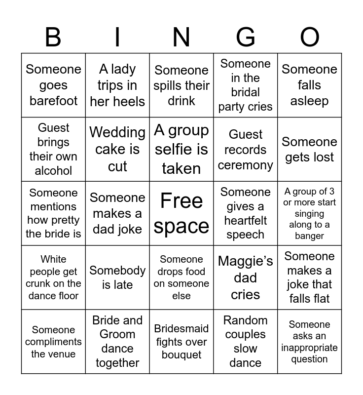 This bingo card has a free space and 27 words: Maggie’s dad cries, Guest wears a wedding color, Guest records ceremony, Bridesmaid fights over bouquet, Guest brings their own alcohol, Someone spills their drink, A lady trips in her heels, White people get crunk on the dance floor, Someone gives a heartfelt speech, Someone makes a joke that falls flat, Someone mentions how pretty the bride is, Someone in the bridal party cries, Someone compliments the venue, Bride and Groom dance together, Someone gets lost, Someone gets seconds, Wedding cake is cut, A group selfie is taken, Somebody is late, Someone goes barefoot, A group of 3 or more start singing along to a banger, Random couples slow dance, Someone makes a dad joke, Someone asks an inappropriate question, Someone drops food on someone else, Someone falls asleep and Someone takes home a decoration.