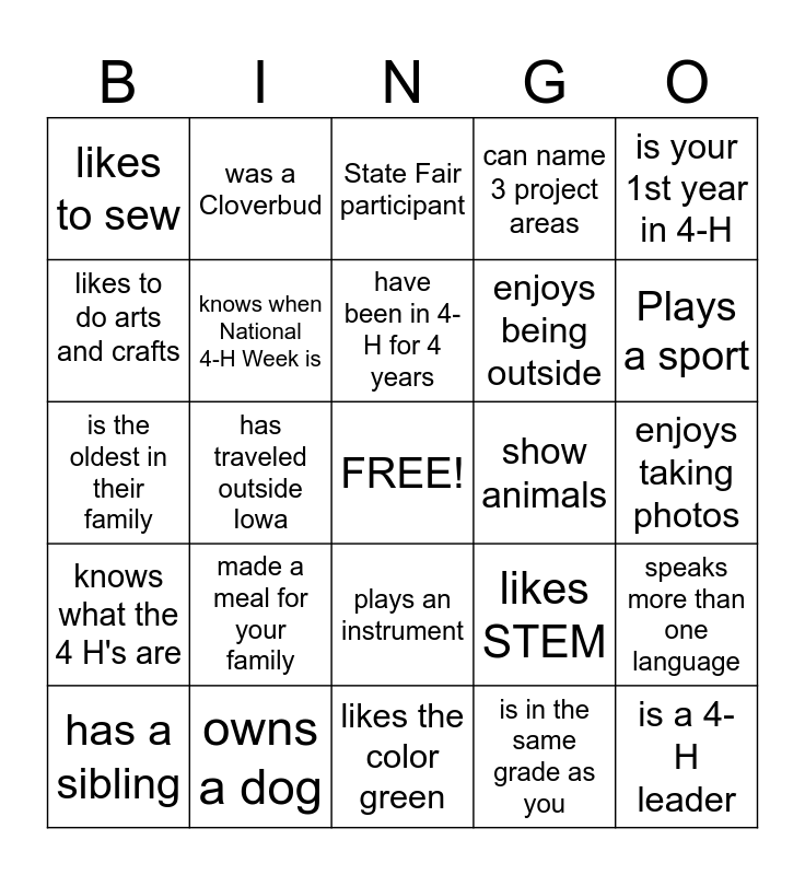 This bingo card has a free space and 24 words: made a meal for your family, owns a dog, have been in 4-H for 4 years, has a sibling, is your 1st year in 4-H, likes to sew, likes to do arts and crafts, was a Cloverbud, show animals, plays an instrument, enjoys being outside, is the oldest in their family, likes STEM, speaks more than one language, knows when National 4-H Week is, is in the same grade as you, enjoys taking photos, State Fair participant, Plays a sport, has traveled outside Iowa, is a 4-H leader, knows what the 4 H's are, can name 3 project areas and likes the color green.