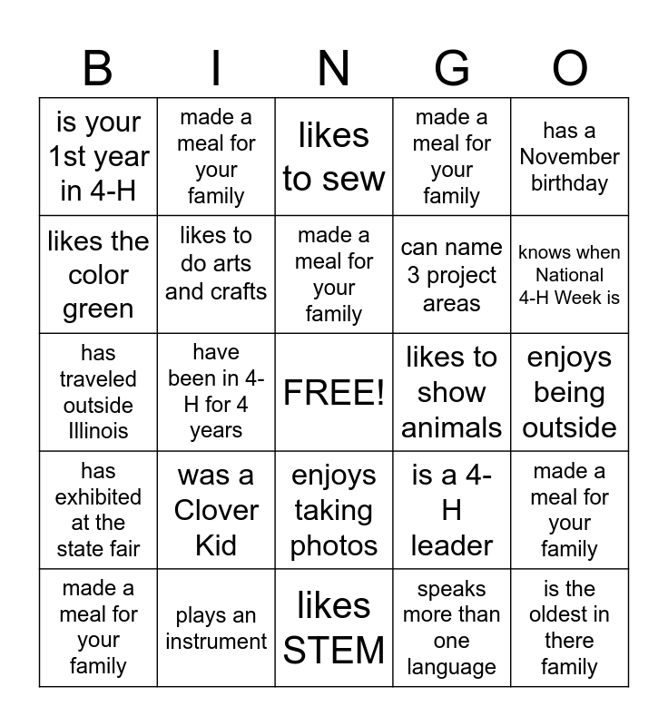 This bingo card has a free space and 29 words: made a meal for your family, owns a dog, have been in 4-H for 4 years, has a sibling, is your 1st year in 4-H, likes to sew, likes to do arts and crafts, was a Clover Kid, likes to show animals, plays an instrument, enjoys being outside, is the oldest in there family, likes STEM, speaks more than one language, knows when National 4-H Week is, is in the same grade as you, enjoys taking photos, has exhibited at the state fair, has a November birthday, has traveled outside Illinois, is a 4-H leader, knows what the 4 H's are, can name 3 project areas, likes the color green, made a meal for your family, made a meal for your family, made a meal for your family, made a meal for your family and made a meal for your family.