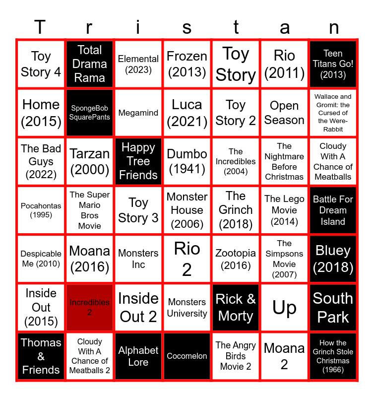 This bingo card has 49 words: Up, Open Season, The Angry Birds Movie 2, The Super Mario Bros Movie, Happy Tree Friends, Battle For Dream Island, Total Drama Rama, Alphabet Lore, Rio (2011), Rio 2, Teen Titans Go! (2013), Frozen (2013), The Nightmare Before Christmas, The Incredibles (2004), Incredibles 2, The Lego Movie (2014), Home (2015), Wallace and Gromit: the Cursed of the Were-Rabbit, South Park, Toy Story, Toy Story 2, Toy Story 3, Toy Story 4, SpongeBob SquarePants, Thomas & Friends, Megamind, Cloudy With A Chance of Meatballs, Cloudy With A Chance of Meatballs 2, Dumbo (1941), Tarzan (2000), How the Grinch Stole Christmas (1966), The Grinch (2018), Inside Out (2015), Inside Out 2, Pocahontas (1995), Zootopia (2016), The Simpsons Movie (2007), Bluey (2018), The Bad Guys (2022), Monsters Inc, Monsters University, Despicable Me (2010), Monster House (2006), Cocomelon, Luca (2021), Elemental (2023), Rick & Morty, Moana (2016) and Moana 2.