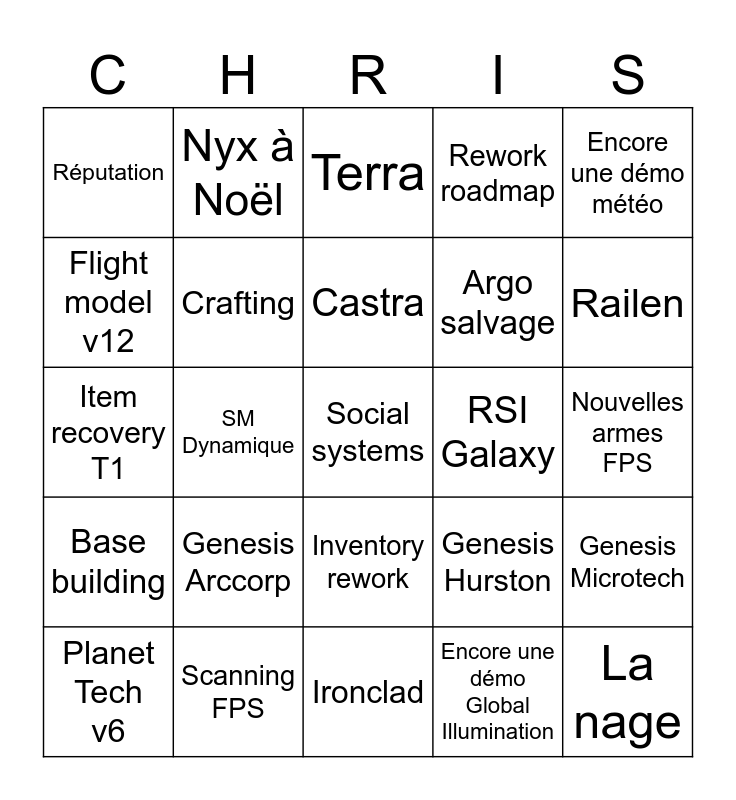This bingo card has 1 images and 32 words: Encore une démo Global Illumination, Maesltrom, SM Dynamique, Engineering, Base building, Crafting, Encore une démo météo, Genesis Microtech, Nyx à Noël, La nage, Castra, Terra, Il parle !, Hacking / Data running, RSI Galaxy, BMM, Planet Tech v6, Item recovery T1, Inventory rework, Genesis Arccorp, Genesis Hurston, Instance PVE Arccorp, Nouvelles armes FPS, Scanning FPS, Social systems, Rework roadmap, Argo salvage, Flight model v12, Réputation, Ironclad, Kraken and Railen.