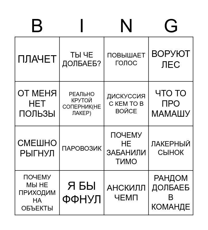 This bingo card has 16 words: Я БЫ ФФНУЛ, ЛАКЕРНЫЙ СЫНОК, ПОВЫШАЕТ ГОЛОС, ПЛАЧЕТ, СМЕШНО РЫГНУЛ, ТЫ ЧЕ ДОЛБАЕБ?, ПОЧЕМУ НЕ ЗАБАНИЛИ ТИМО, АНСКИЛЛ ЧЕМП, ОТ МЕНЯ НЕТ ПОЛЬЗЫ, РЕАЛЬНО КРУТОЙ СОПЕРНИК(НЕ ЛАКЕР), ПОЧЕМУ МЫ НЕ ПРИХОДИМ НА ОБЪЕКТЫ, ВОРУЮТ ЛЕС, ПАРОВОЗИК, ЧТО ТО ПРО МАМАШУ, ДИСКУССИЯ С КЕМ ТО В ВОЙСЕ and РАНДОМ ДОЛБАЕБ В КОМАНДЕ.