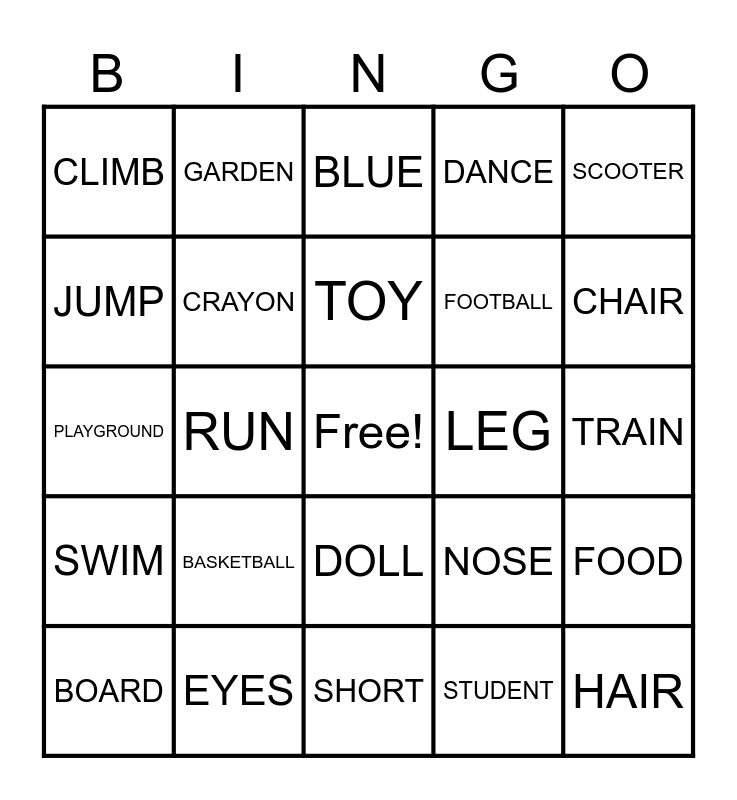 This bingo card has a free space and 63 words: BEDROOM, BED, KITCHEN, FOOD, LIVING ROOM, LAMP, GARDEN, CAT, TOY, CAR, DOLL, BALL, TRAIN, SCOOTER, WALK, JUMP, RUN, CLIMB, PIANO, FOOTBALL, BASKETBALL, SWIM, DANCE, SING, APPLE, BANANA, WATERMELON, ORANGE, GRAPE, RICE, BEANS, BURGER, CLASSROOM, TABLE, CHAIR, BOARD, TEACHER, STUDENT, PENCIL, CRAYON, PLAYGROUND, LEG, ARM, HEAD, HAIR, EYES, EARS, NOSE, HAND, FEET, LONG, SHORT, BUS, BOAT, BROWN, BLUE, RED, YELLOW, GREEN, BLACK, PURPLE, HAPPY and SAD.