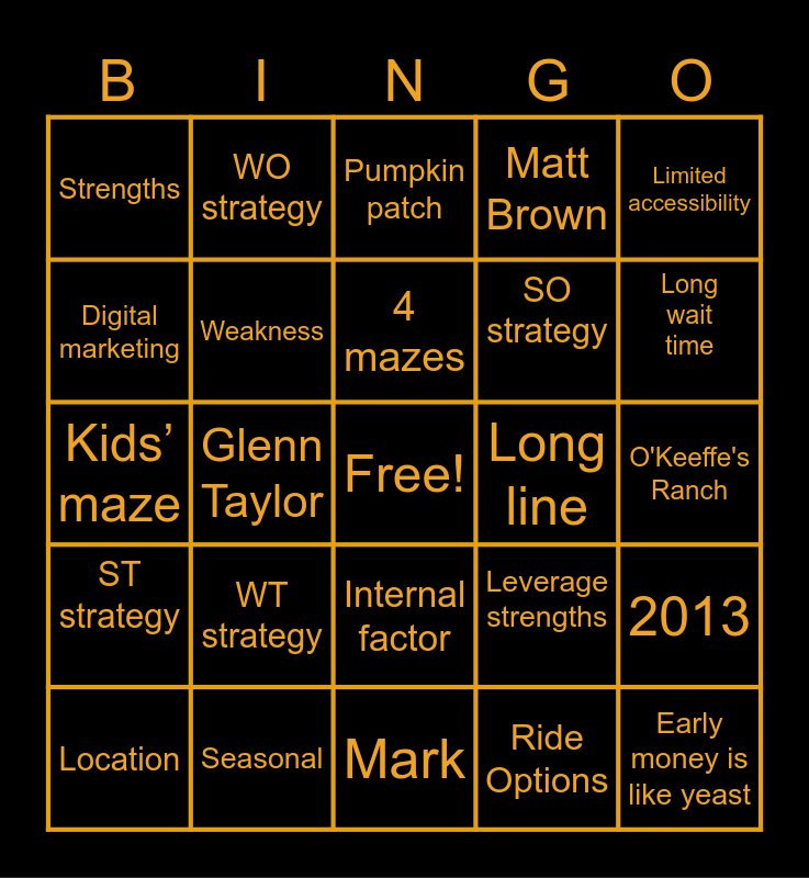 This bingo card has a free space and 24 words: WT strategy, Seasonal, 4 mazes, Location, Limited accessibility, Strengths, Digital marketing, WO strategy, Long line, Internal factor, SO strategy, Kids’ maze, Leverage strengths, 2013, Weakness, Ride Options, O'Keeffe's Ranch, Pumpkin patch, Long wait time, Glenn Taylor, Early money is like yeast, ST strategy, Matt Brown and Mark.