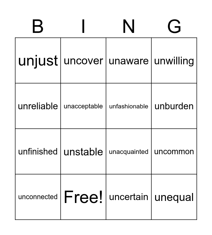 This bingo card has 16 words: Free!, uncommon, unaware, unjust, unfinished, uncover, unacquainted, uncertain, unreliable, unacceptable, unconnected, unwilling, unstable, unburden, unfashionable and unequal.