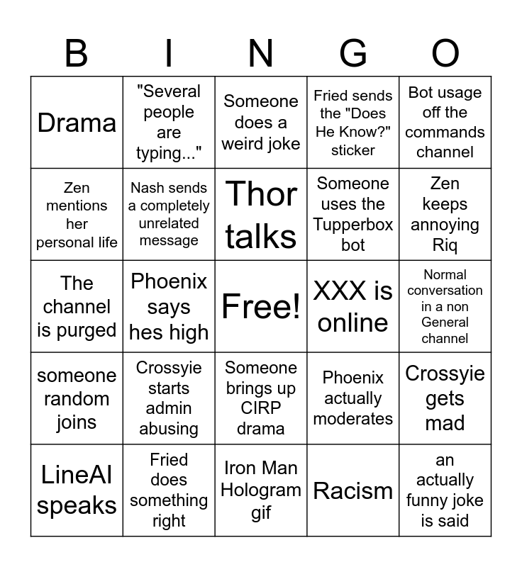 This bingo card has a free space and 24 words: Crossyie starts admin abusing, Fried does something right, Thor talks, LineAI speaks, Bot usage off the commands channel, Drama, Zen mentions her personal life, "Several people are typing...", XXX is online, Someone brings up CIRP drama, Someone uses the Tupperbox bot, The channel is purged, Phoenix actually moderates, Crossyie gets mad, Nash sends a completely unrelated message, Racism, Normal conversation in a non General channel, Someone does a weird joke, Zen keeps annoying Riq, Phoenix says hes high, an actually funny joke is said, someone random joins, Fried sends the "Does He Know?" sticker and Iron Man Hologram gif.