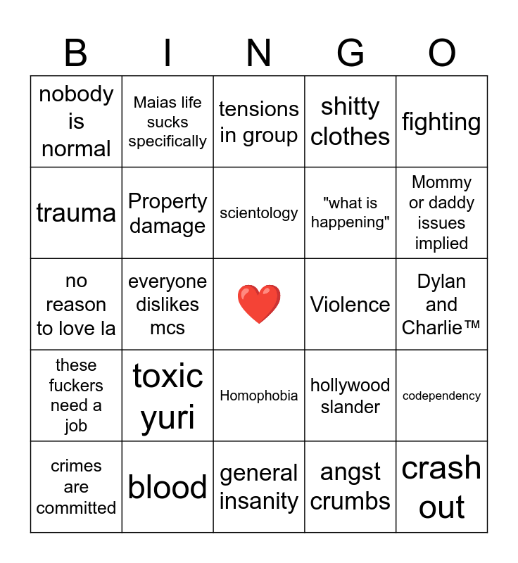 This bingo card has a free space and 24 words: toxic yuri, blood, scientology, crimes are committed, fighting, nobody is normal, trauma, Maias life sucks specifically, Violence, Homophobia, "what is happening", no reason to love la, hollywood slander, codependency, Property damage, angst crumbs, Dylan and Charlie™, tensions in group, Mommy or daddy issues implied, everyone dislikes mcs, crash out, these fuckers need a job, shitty clothes and general insanity.