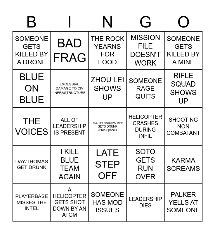 This bingo card has a free space and 24 words: I KILL BLUE TEAM AGAIN, A HELICOPTER GETS SHOT DOWN BY AN ATGM, ZHOU LEI SHOWS UP, PLAYERBASE MISSES THE INTEL, SOMEONE GETS KILLED BY A MINE, SOMEONE GETS KILLED BY A DRONE, BLUE ON BLUE, BAD FRAG, HELICOPTER CRASHES DURING INFIL, LATE STEP OFF, SOMEONE RAGE QUITS, THE VOICES, SOTO GETS RUN OVER, KARMA SCREAMS, EXCESSIVE DAMAGE TO CIV INFRASTRUCTURE, LEADERSHIP DIES, SHOOTING NON COMBATANT, THE ROCK YEARNS FOR FOOD, RIFLE SQUAD SHOWS UP, ALL OF LEADERSHIP IS PRESENT, PALKER YELLS AT SOMEONE, DAY/THOMAS GET DRUNK, MISSION FILE DOESN'T WORK and SOMEONE HAS MOD ISSUES.