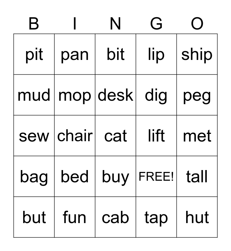 This bingo card has 25 words: bed, cab, desk, but, ship, pit, mud, pan, lift, buy, dig, sew, FREE!, tall, mop, hut, met, bit, peg, chair, cat, fun, bag, lip and tap.