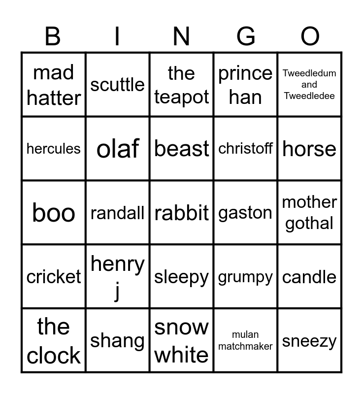 This bingo card has 58 words: mulan, shang, mushu, cricket, mulan matchmaker, anna, olaf, stven, christoff, elsa, prince han, alice, cheshire cat, catapiller, queen of hearts, mad hatter, rabbit, Tweedledum and Tweedledee, bella, beast, gaston, the teapot, the clock, candle, repunzel, mother gothal, flin rider, cameleon, horse, jasmine, carpet, aladin, ginnie, tiger, jafar, mike, sully, randall, boo, roz, henry j, sneezy, grumpy, happy, dopey, doc, bashful, sleepy, snow white, apple, witch, Ariel, flounder, sebastian, scuttle, king triton, hercules and megara.
