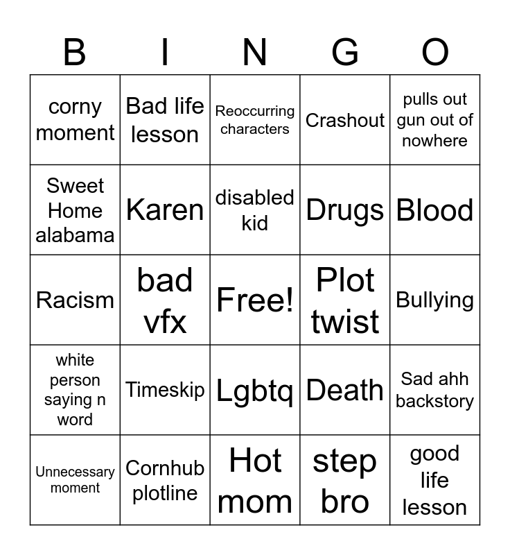 This bingo card has a free space and 24 words: Timeskip, Cornhub plotline, disabled kid, Unnecessary moment, pulls out gun out of nowhere, corny moment, Sweet Home alabama, Bad life lesson, Plot twist, Lgbtq, Drugs, Racism, Death, Sad ahh backstory, Karen, step bro, Bullying, Reoccurring characters, Blood, bad vfx, good life lesson, white person saying n word, Crashout and Hot mom.