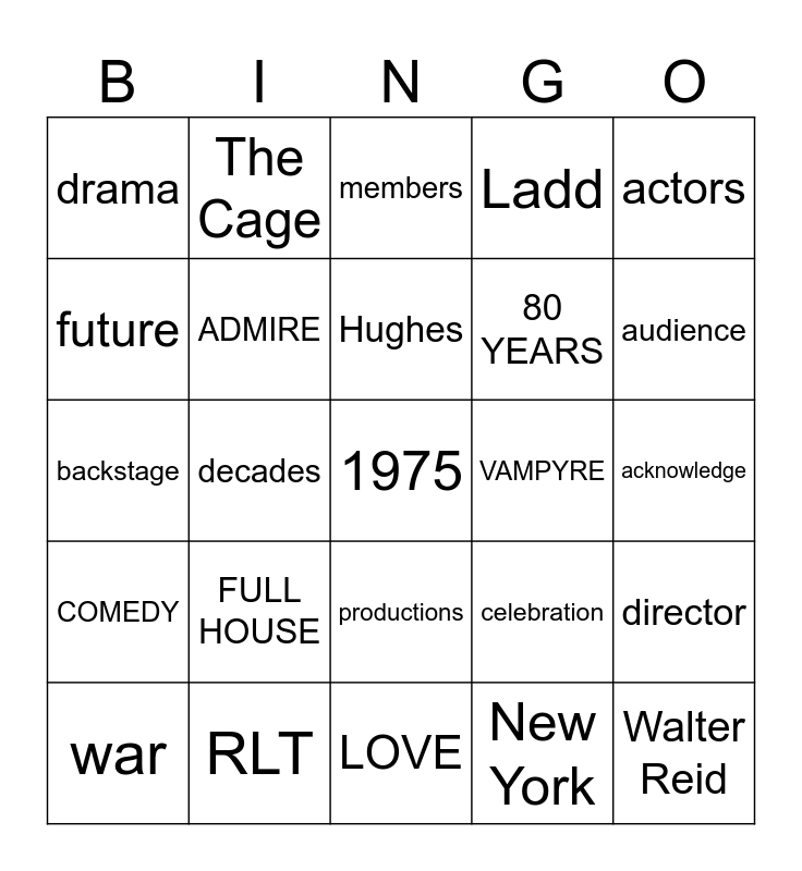 This bingo card has 30 words: RLT, front of house, decades, Rockhampton, drama, members, ADMIRE, productions, VAMPYRE, LOVE, acknowledge, 1975, New York, Walter Reid, audience, audition, celebration, COMEDY, FULL HOUSE, actors, backstage, roving mic, The Cage, 80 YEARS, future, Ladd, director, war, Hughes and Kangaroo.