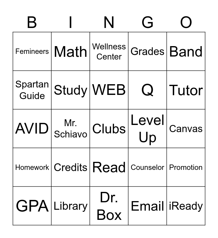 This bingo card has 25 words: Credits, Dr. Box, WEB, GPA, Band, Femineers, Spartan Guide, Math, Level Up, Read, Q, AVID, Counselor, Promotion, Study, iReady, Canvas, Wellness Center, Tutor, Mr. Schiavo, Clubs, Library, Homework, Grades and Email.