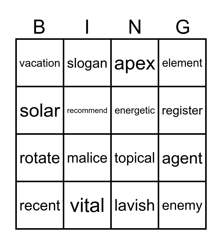 This bingo card has 20 words: agent, musical, apex, donut, recent, solar, vital, vacation, rotate, slogan, malice, topical, recommend, enemy, energetic, honest, register, element, lavish and minimum.