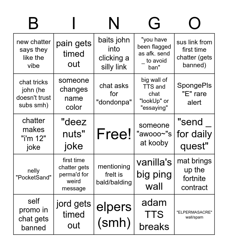 This bingo card has a free space and 24 words: first time chatter gets perma'd for weird message, jord gets timed out, chat asks for "dondonpa", self promo in chat gets banned, sus link from first time chatter (gets banned), new chatter says they like the vibe, chat tricks john (he doesn't trust subs smh), pain gets timed out, someone "awooo~"s at kooby, mentioning frelt is bald/balding, big wall of TTS and chat "lookUp" or "essaying", chatter makes "i'm 12" joke, vanilla's big ping wall, mat brings up the fortnite contract, someone changes name color, adam TTS breaks, "send _ for daily quest", baits john into clicking a silly link, SpongePls "E" rare alert, "deez nuts" joke, "ELPERMASACRE" wall/spam, nelly "PocketSand", "you have been flagged as afk. send _ to avoid ban" and elpers (smh).