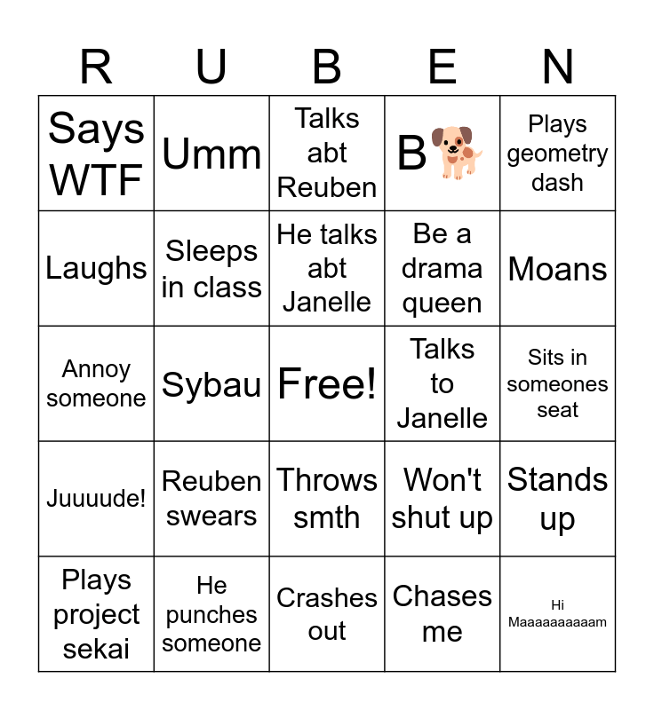 This bingo card has a free space and 24 words: Reuben swears, He punches someone, He talks abt Janelle, Plays project sekai, Plays geometry dash, Says WTF, Laughs, Umm, Talks to Janelle, Throws smth, Be a drama queen, Annoy someone, Won't shut up, Stands up, Sleeps in class, Chases me, Sits in someones seat, Talks abt Reuben, Moans, Sybau, Hi Maaaaaaaaaam, Juuuude!, B🐕 and Crashes out.