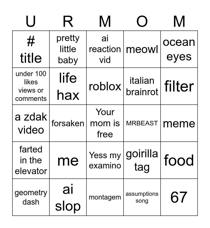 This bingo card has a free space and 24 words: me, ai slop, roblox, geometry dash, ocean eyes, # title, under 100 likes views or comments, pretty little baby, MRBEAST, Yess my examino, italian brainrot, a zdak video, goirilla tag, food, life hax, assumptions song, meme, ai reaction vid, filter, forsaken, 67, farted in the elevator, meowl and montagem.
