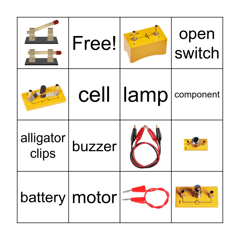 This bingo card has 8 images and 11 words: Free!, alligator clips, buzzer, cell, lamp, motor, battery, wire, open switch, component and circuit.