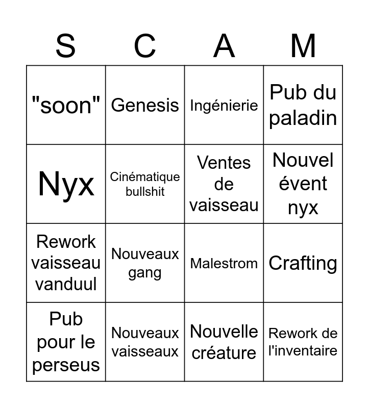 This bingo card has 16 words: Nouveaux vaisseaux, Crafting, Ingénierie, "soon", Rework vaisseau vanduul, Genesis, Malestrom, Nouvelle créature, Nyx, Cinématique bullshit, Pub pour le perseus, Pub du paladin, Nouveaux gang, Nouvel évent nyx, Ventes de vaisseau and Rework de l'inventaire.
