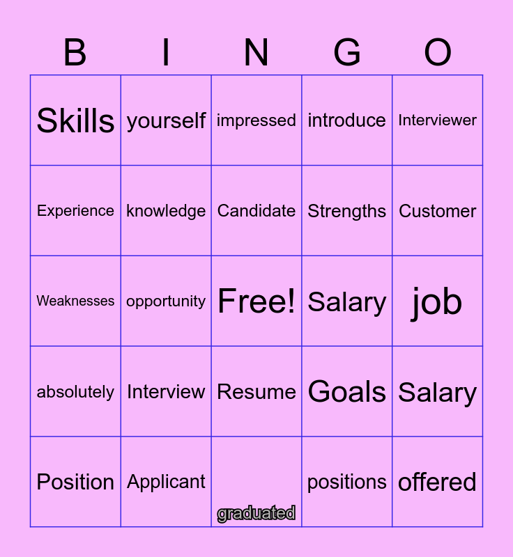 This bingo card has a free space and 24 words: Interview, Applicant, Candidate, Position, Interviewer, Skills, Experience, yourself, Salary, Resume, Strengths, Weaknesses, Goals, Salary, knowledge, positions, job, impressed, Customer, opportunity, offered, absolutely, introduce and graduated.