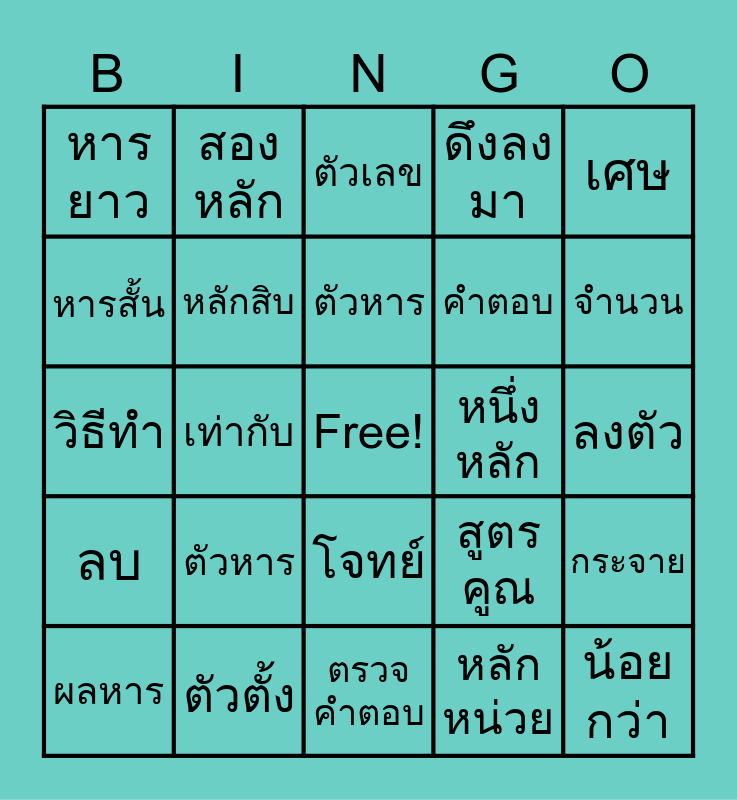 This bingo card has a free space and 24 words: ตัวหาร, ตัวตั้ง, ตัวหาร, ผลหาร, เศษ, หารยาว, หารสั้น, สองหลัก, หนึ่งหลัก, โจทย์, คำตอบ, วิธีทำ, สูตรคูณ, กระจาย, หลักสิบ, หลักหน่วย, ลงตัว, ตัวเลข, จำนวน, เท่ากับ, น้อยกว่า, ลบ, ดึงลงมา and ตรวจคำตอบ.