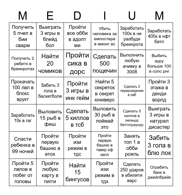 This bingo card has 36 words: Пройти первую башню в тавер оф хелл, Пройти изи режим в тдс, Пройти изи режим в тдх, Получить 2 ребитх в бреинротах, Заработать 10к в гаг, Найти 5 секреток в секрет юниверс, Найти 20 чомиков, Найти 15 бингусов, Заработать 100к в не разбуди бреинрота, Занять топ 1 в обби рояль, Выбить ауру больше 100 в солс рнг, Убить человека за импостера в амонг ас, Забить 3 гола в блю лок, Забить 3 гола в баскетболе, Сделать 500 пощечин, Получить 5 пчел в бии сварм, Спасти ребенка в 99 ночей, Сделать 2 перерождения в пвб, Прокачать 100 лвл в блокс врукт, Пройти все обби в адопт ми, Пройти 3 игры в инк гейм, Выловить 15 рыб в фиш, Выловить 30 рыб в поймай это, Сделать 5 киллов в тсб, Сделать 5 киллов в легендс баттлграундс, Выиграть 3 игры в блейд бол, Выполнить любую ачивку в 3008, Пройти любую карту в пигги, Пройти сика в дорс, Заработать 400к в нфт батл, Ограбить банк в джейлбрейк, Пройти 5 лвлов в побег от головы, Выиграть 3 игры в натурал дисастер, Пройти 3 этажа в денди ворлд, Пройти первую башню в етох and Сделать 250 ударов в абилити варс.