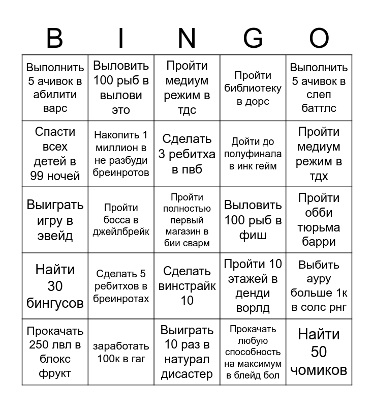 This bingo card has a free space and 24 words: Сделать 5 ребитхов в бреинротах, заработать 100к в гаг, Сделать 3 ребитха в пвб, Прокачать 250 лвл в блокс фрукт, Выполнить 5 ачивок в слеп баттлс, Выполнить 5 ачивок в абилити варс, Спасти всех детей в 99 ночей, Выловить 100 рыб в вылови это, Выловить 100 рыб в фиш, Сделать винстрайк 10, Дойти до полуфинала в инк гейм, Выиграть игру в эвейд, Пройти 10 этажей в денди ворлд, Выбить ауру больше 1к в солс рнг, Накопить 1 миллион в не разбуди бреинротов, Прокачать любую способность на максимум в блейд бол, Пройти обби тюрьма барри, Пройти медиум режим в тдс, Пройти медиум режим в тдх, Пройти босса в джейлбрейк, Найти 50 чомиков, Найти 30 бингусов, Пройти библиотеку в дорс and Выиграть 10 раз в натурал дисастер.