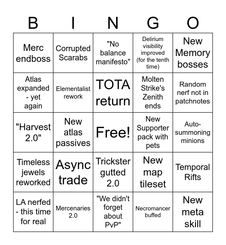 This bingo card has a free space and 24 words: Async trade, Mercenaries 2.0, TOTA return, LA nerfed - this time for real, New Memory bosses, Merc endboss, Atlas expanded - yet again, Corrupted Scarabs, New Supporter pack with pets, Trickster gutted 2.0, Molten Strike's Zenith ends, "Harvest 2.0", New map tileset, Temporal Rifts, Elementalist rework, Necromancer buffed, Auto-summoning minions, "No balance manifesto", Random nerf not in patchnotes, New atlas passives, New meta skill, Timeless jewels reworked, Delirium visibility improved (for the tenth time) and "We didn't forget about PvP".