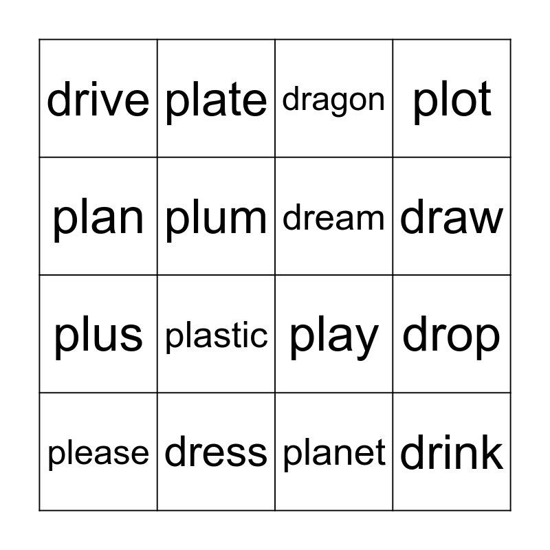 This bingo card has 16 words: dress, drop, dragon, drive, plus, plate, play, planet, plan, plum, please, plot, plastic, draw, dream and drink.