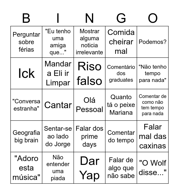 This bingo card has a free space and 24 words: Sentar-se ao lado do Jorge, Não entender uma piada, Riso falso, "Adoro esta música", Podemos?, Perguntar sobre férias, Ick, "Eu tenho uma amiga que...", Quanto tá o peixe Mariana, Falar dos prime days, Comentário dos graduates, "Conversa estranha", Comentar do tempo, Falar mal das caxinas, Mandar a Eli ir Limpar, Falar de algo que não sabe, Comentar de como não tem tempo para nada, Mostrar alguma noticia irrelevante, "Não tenho tempo para nada", Cantar, "O Wolf disse...", Geografia big brain, Comida cheirar mal and Dar Yap.