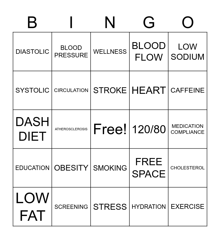 This bingo card has a free space and 25 words: OBESITY, STRESS, STROKE, LOW FAT, LOW SODIUM, DIASTOLIC, SYSTOLIC, BLOOD PRESSURE, 120/80, SMOKING, HEART, DASH DIET, FREE SPACE, CHOLESTEROL, CIRCULATION, PLAQUE, MEDICATION COMPLIANCE, WELLNESS, CAFFEINE, ATHEROSCLEROSIS, EXERCISE, SCREENING, EDUCATION, BLOOD FLOW and HYDRATION.