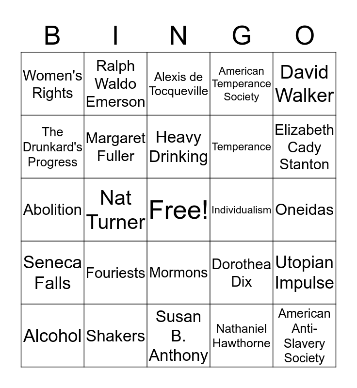 This bingo card has a free space and 24 words: Fouriests, Shakers, Heavy Drinking, Alcohol, David Walker, Women's Rights, The Drunkard's Progress, Ralph Waldo Emerson, Individualism, Mormons, Temperance, Abolition, Dorothea Dix, Utopian Impulse, Margaret Fuller, Nathaniel Hawthorne, Oneidas, Alexis de Tocqueville, Elizabeth Cady Stanton, Nat Turner, American Anti-Slavery Society, Seneca Falls, American Temperance Society and Susan B. Anthony.