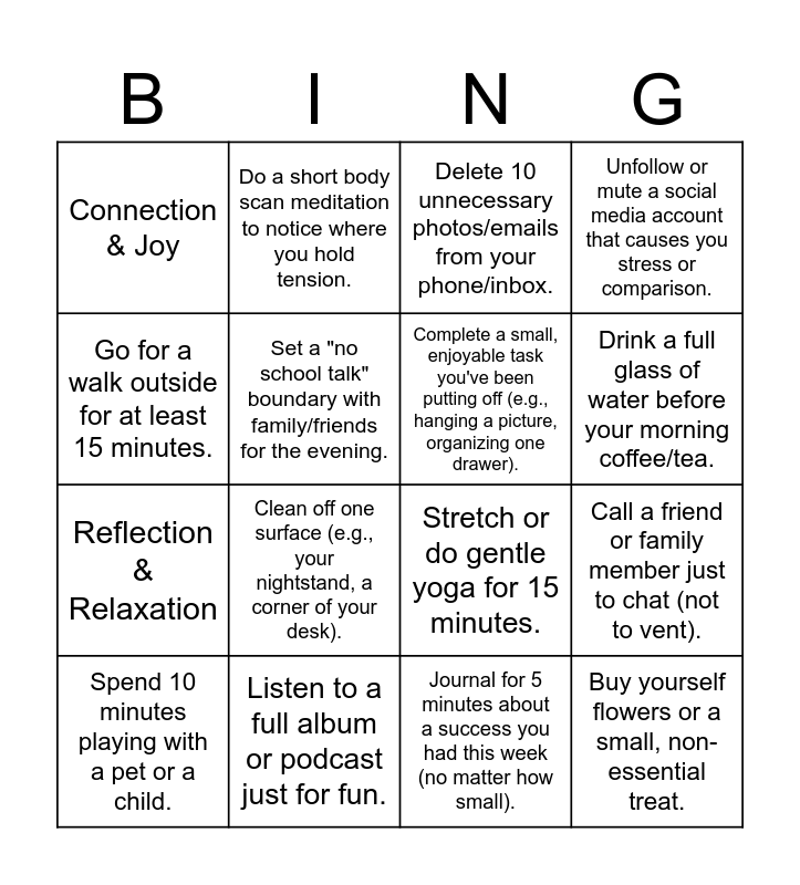 This bingo card has 35 words: Mind & Mental Health, Write down three things you're grateful for today., Take 10 deep, focused breaths (Box Breathing)., Complete a small, enjoyable task you've been putting off (e.g., hanging a picture, organizing one drawer)., Spend 10 minutes on a hobby that is not lesson planning., Unfollow or mute a social media account that causes you stress or comparison., Set a "no school talk" boundary with family/friends for the evening., Body & Movement, Drink a full glass of water before your morning coffee/tea., Take a 20-minute nap or practice Yoga Nidra (guided rest)., Stretch or do gentle yoga for 15 minutes., Go for a walk outside for at least 15 minutes., Eat a healthy, sit-down lunch away from your desk (even if it's just in another part of the room)., Get to bed 30 minutes earlier than usual., Connection & Joy, Listen to a full album or podcast just for fun., Laugh! Watch a funny video or talk to a person who makes you smile., Call a friend or family member just to chat (not to vent)., Buy yourself flowers or a small, non-essential treat., Spend 10 minutes playing with a pet or a child., Light a candle or use an essential oil diffuser during your non-work time., Space & Time Boundaries, Set a timer and put away all school papers/devices until the morning., Schedule a dedicated block of time in your week (30+ minutes) for nothing., Delete 10 unnecessary photos/emails from your phone/inbox., Clean off one surface (e.g., your nightstand, a corner of your desk)., Do not check your work email after ., Say "no" to a request that would have over-extended you., Reflection & Relaxation, Journal for 5 minutes about a success you had this week (no matter how small)., Take a warm bath or shower and use a luxurious soap or product., Read a book (non-professional reading) for 20 minutes., Stare out a window or at the sky for 5 minutes without checking your phone., Do a short body scan meditation to notice where you hold tension. and Forgive yourself for something you feel you didn't do perfectly today..