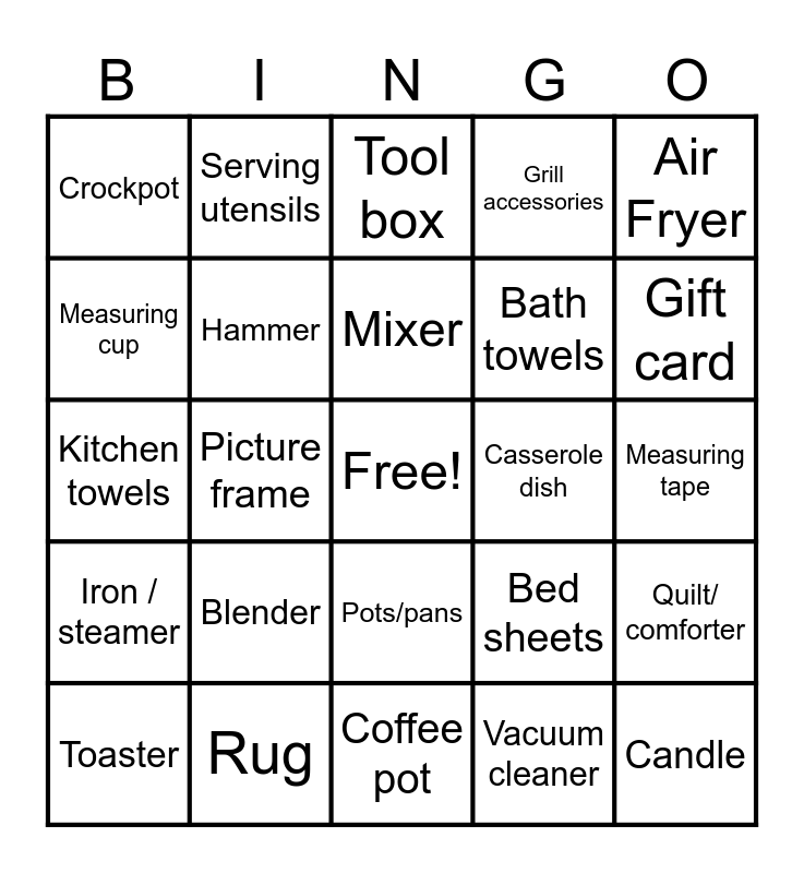 This bingo card has a free space and 25 words: Blender, Coffee pot, Mixer, Toaster, Air Fryer, Crockpot, Measuring cup, Serving utensils, Casserole dish, Pots/pans, Bath towels, Kitchen towels, Bed sheets, Quilt/ comforter, Hammer, Screwdriver/drill, Measuring tape, Tool box, Gift card, Picture frame, Candle, Rug, Iron / steamer, Grill accessories and Vacuum cleaner.