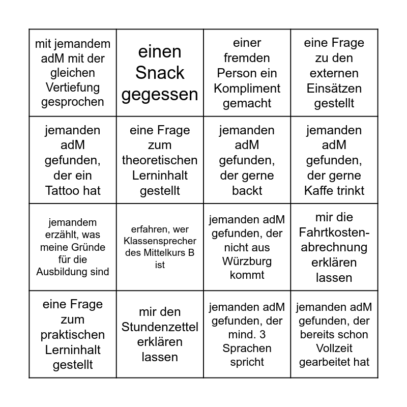 This bingo card has 16 words: mir den Stundenzettel erklären lassen, mir die Fahrtkosten- abrechnung erklären lassen, einer fremden Person ein Kompliment gemacht, mit jemandem adM mit der gleichen Vertiefung gesprochen, jemandem erzählt, was meine Gründe für die Ausbildung sind, einen Snack gegessen, jemanden adM gefunden, der nicht aus Würzburg kommt, jemanden adM gefunden, der mind. 3 Sprachen spricht, jemanden adM gefunden, der ein Tattoo hat, eine Frage zum theoretischen Lerninhalt gestellt, eine Frage zum praktischen Lerninhalt gestellt, eine Frage zu den externen Einsätzen gestellt, erfahren, wer Klassensprecher des Mittelkurs B ist, jemanden adM gefunden, der gerne Kaffe trinkt, jemanden adM gefunden, der gerne backt and jemanden adM gefunden, der bereits schon Vollzeit gearbeitet hat.