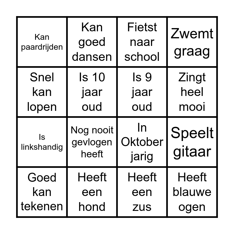 This bingo card has 28 words: Heeft een broer, kan een radslag, Is linkshandig, Niet bang is voor spinnen, Is 10 jaar oud, Fietst naar school, Kan goed dansen, Heeft blauwe ogen, Heeft een hond, Ooit iets gebroken, In Oktober jarig, Zwemt graag, Is bang in het donker, Speelt piano, Nog nooit gevlogen heeft, Eet graag pizza, Heeft een kat, Is 9 jaar oud, Zingt heel mooi, Is jarig in Januari, Kan paardrijden, Kan een radslag, Goed kan tekenen, Speelt gitaar, Heeft een zus, Draagt een bril, Snel kan lopen and Graag frietjes eet.