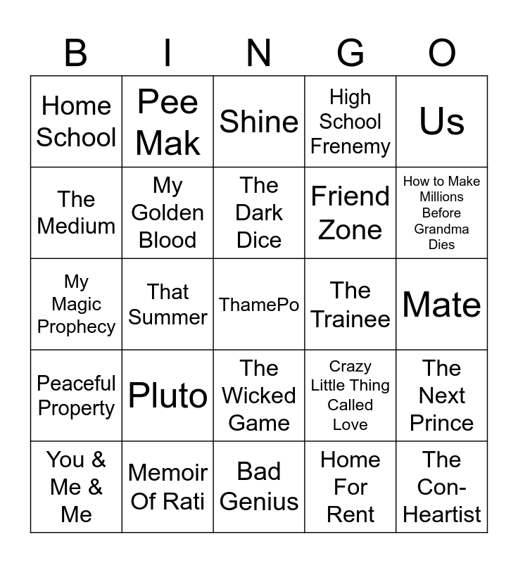 This bingo card has 41 words: Free!, My Magic Prophecy, The Heart Killers, My Golden Blood, Memoir Of Rati, The Wicked Game, The Dark Dice, Boys In Love, Us, Peaceful Property, That Summer, High School Frenemy, ThamePo, Mate, The Trainee, Pluto, Khemjira, Home School, Perfect 10 Liners, Shine, The Next Prince, The Con-Heartist, Bad Genius, Friend Zone, Suddenly 20, The Paradise of Thorns, Home For Rent, Mansuang, How to Make Millions Before Grandma Dies, Love You to Debt, Not Friends, Pee Mak, You & Me & Me, Suckseed, Crazy Little Thing Called Love, The Medium, Brother Of The Year, Shutter, ATM: Er Rak Error, Hello Stranger and Happy Old Year.