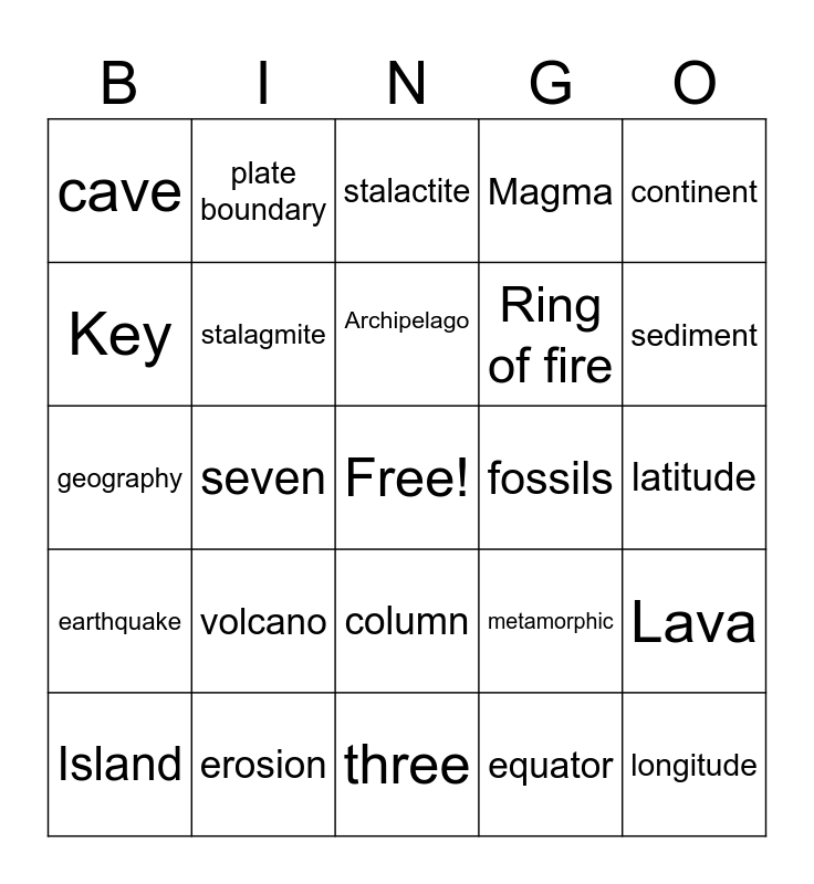 This bingo card has a free space and 30 words: erosion, minerals, seven, range, cave, stalactite, stalagmite, column, fossils, three, latitude, longitude, equator, prime meridian, sediment, igneous, metamorphic, earthquake, volcano, continent, geography, paleontologist, plate boundary, Ring of fire, Key, Magma, Lava, Island, Archipelago and compass rose.