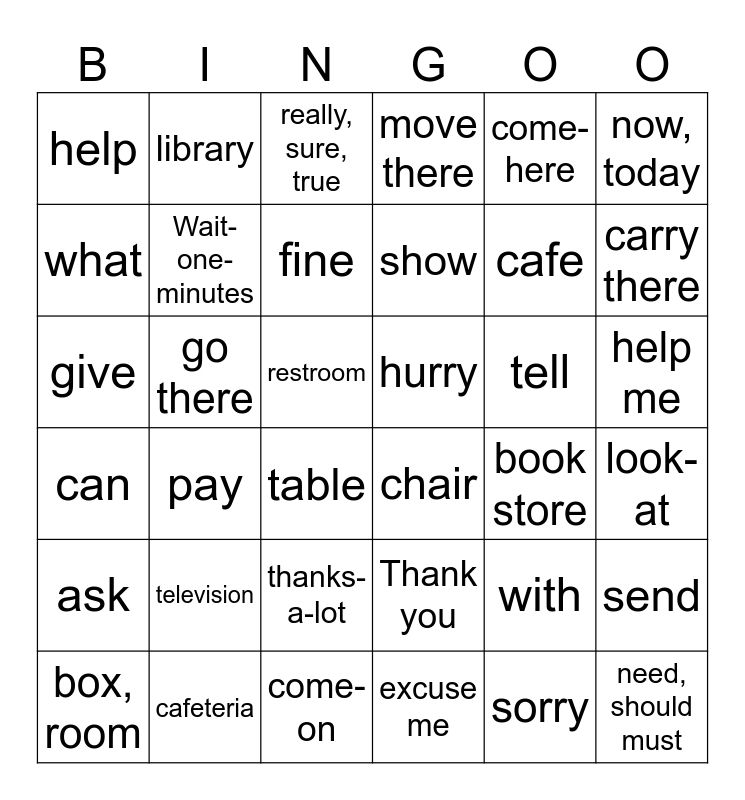 This bingo card has 36 words: Thank you, thanks-a-lot, excuse me, what, can, hurry, Wait-one-minutes, come-on, come-here, with, carry there, move there, send, go there, show, help, ask, tell, give, really, sure, true, restroom, pay, chair, table, book store, library, cafe, cafeteria, fine, now, today, need, should must, box, room, look-at, help me, television and sorry.