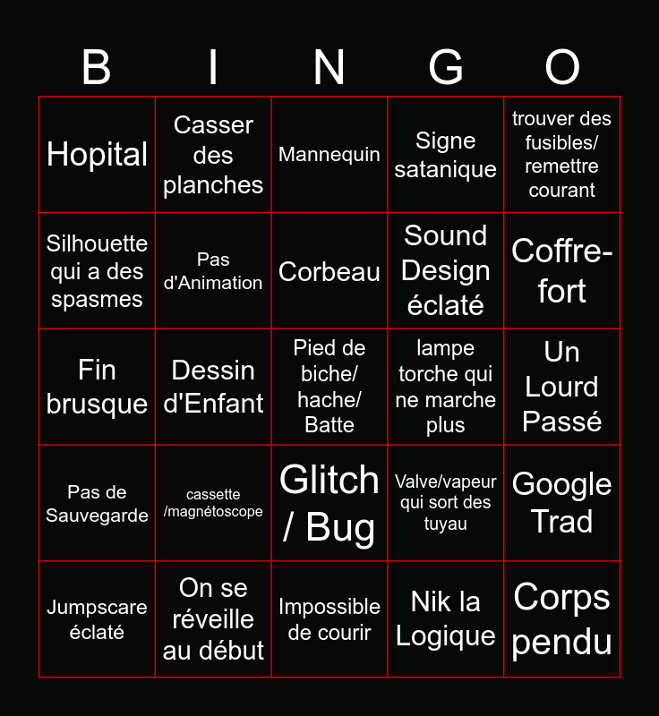 This bingo card has 74 words: Poupée/Mamie Creepy, Téléphone qui sonne, Mannequin, Temps orageux / Pluie, Screamer Fenêtre, Briquet, Ampoule qui éclate, Radio creepy, lampe torche qui ne marche plus, Course poursuite dans un couloir/long chemin, Asset connus, "Cache-cache", Pied de biche/ hache/ Batte, Signe satanique, Accident de voiture, Jumpscare éclaté, cassette /magnétoscope, Glitch / Bug, Hurlement, trouver des fusibles/ remettre courant, Fin brusque, Casser des planches, Corbeau, Valve/vapeur qui sort des tuyau, Coffre-fort, porte qui se ferme toute seule, solution à côté de l'énigme, Enfant, Caisse/ meuble / Carton qui bloque un accès, tableau qui vole / tombe, Silhouette qui a des spasmes, Aucune Arme, Tv qui s'allume, Perso meurt à la fin, Corps pendu, Sous-Sol, Perte de Mémoire, cinématique inskippable, "On voit rien", Jumpscare bcp trop fort, Pas d'inventaire, Dessin d'Enfant, même Photo / Tableau, Écriture ensanglanté, Tél qui ne marche pas, Hopital, On se réveille au début, Chaise qui bouge, Personne disparue, Qqn à Poil, Maladie mentale, Écriture sur les Murs, Impossible de courir, Histoire ds des lettres/ Texte, Toilettes Sales, Tiroir Vide Simulator, Pas d'Animation, Lumière Rouge, Trop Cher, Google Trad, Pas de Sauvegarde, Trop de Trophées, Véhicule en Panne, Nik la Logique, Un Lourd Passé, Trouver +5 Clés, Mur Invisible, Du Sang partout, Sound Design éclaté, Épouse divorcée ou morte, Doublage Dégueu / IA, Cannette / Alcohol, Vieille Photo en Sépia/ N&B and Journal Audio.