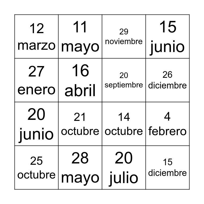 This bingo card has 23 words: 15 diciembre, 28 mayo, 26 diciembre, 10 julio, 27 enero, 12 marzo, 16 abril, 11 mayo, 25 octubre, 2 abril, 21 octubre, 20 junio, 9 octubre, 1 octubre, 28 mayo, 24 noviembre, 29 noviembre, 14 octubre, 20 septiembre, 4 febrero, 15 junio, 20 julio and 14 agosto.