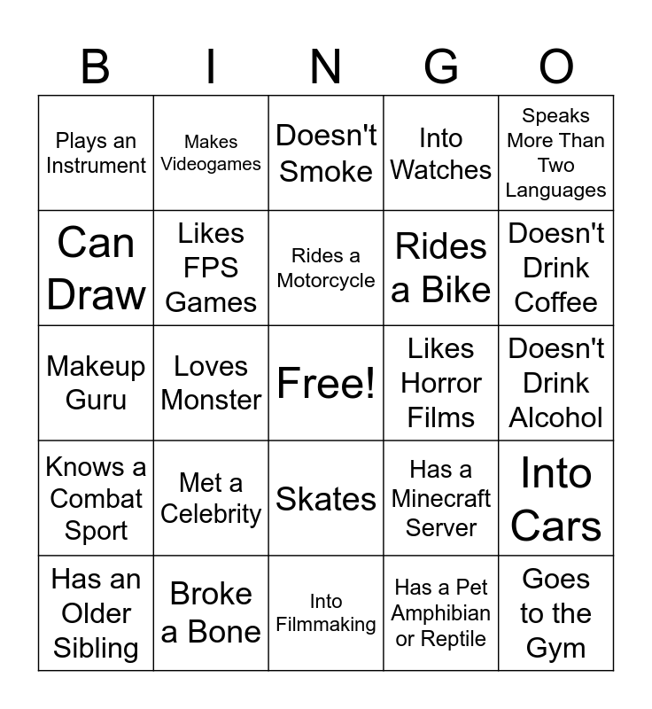 This bingo card has a free space and 24 words: Met a Celebrity, Broke a Bone, Rides a Motorcycle, Has an Older Sibling, Speaks More Than Two Languages, Plays an Instrument, Can Draw, Makes Videogames, Likes Horror Films, Skates, Rides a Bike, Makeup Guru, Has a Minecraft Server, Into Cars, Likes FPS Games, Has a Pet Amphibian or Reptile, Doesn't Drink Alcohol, Doesn't Smoke, Doesn't Drink Coffee, Loves Monster, Goes to the Gym, Knows a Combat Sport, Into Watches and Into Filmmaking.
