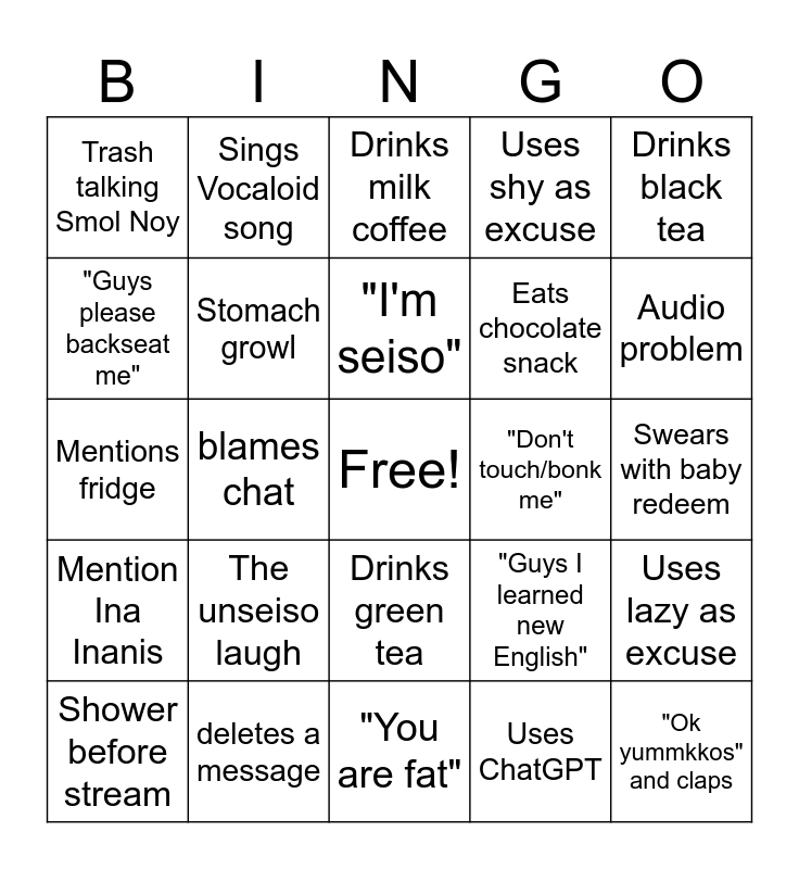 This bingo card has a free space and 30 words: deletes a message, "I ate bento", blames chat, "Foo- friend", Trash talking Smol Noy, Drinks milk coffee, Stomach growl, Drinks green tea, "Don't touch/bonk me", "You are fat", Swears with baby redeem, "Ok yummkkos" and claps, Uses ChatGPT, Gets mad at English joke, Audio problem, Sings The Greatest Showman song, "Guys I learned new English", Mention Ina Inanis, The unseiso laugh, Drinks black tea, Mentions fridge, "Stop distracting me", Sings Vocaloid song, Eats chocolate snack, "Guys please backseat me", Uses shy as excuse, Uses lazy as excuse, Shower before stream, "I'm seiso" and "fake news".