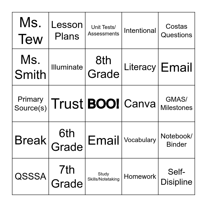 This bingo card has a free space and 24 words: 6th Grade, 7th Grade, 8th Grade, QSSSA, Costas Questions, Ms. Tew, Ms. Smith, Lesson Plans, Canva, Email, Literacy, Primary Source(s), Vocabulary, Notebook/ Binder, Illuminate, Homework, GMAS/ Milestones, Unit Tests/ Assessments, Email, Trust, Self-Disipline, Break, Intentional and Study Skills/Notetaking.