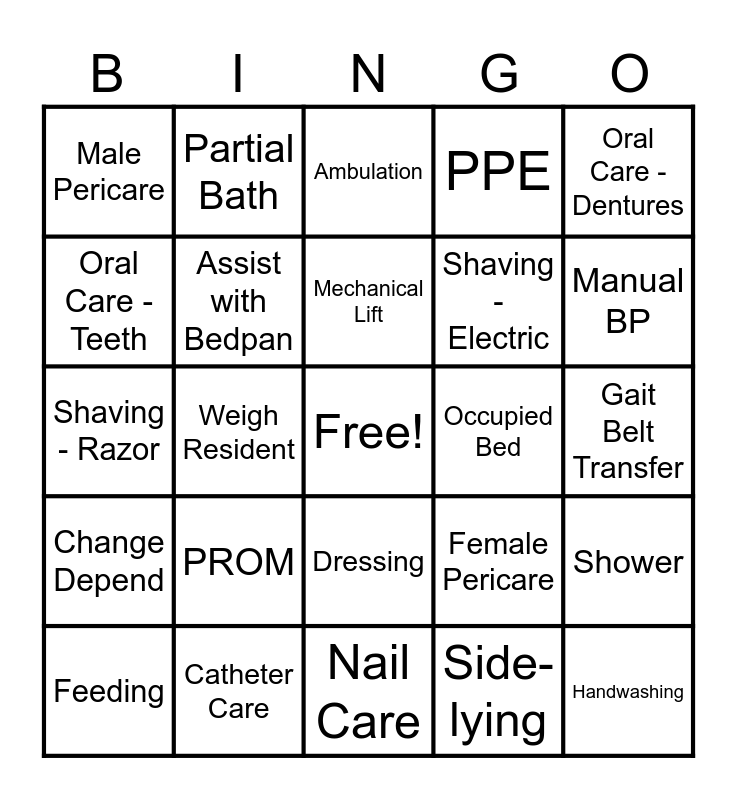 This bingo card has a free space and 24 words: PROM, Catheter Care, Mechanical Lift, Feeding, Oral Care - Dentures, Male Pericare, Oral Care - Teeth, Partial Bath, Occupied Bed, Dressing, Shaving - Electric, Shaving - Razor, Female Pericare, Shower, Assist with Bedpan, Side-lying, Gait Belt Transfer, Ambulation, Manual BP, Weigh Resident, Handwashing, Change Depend, PPE and Nail Care.